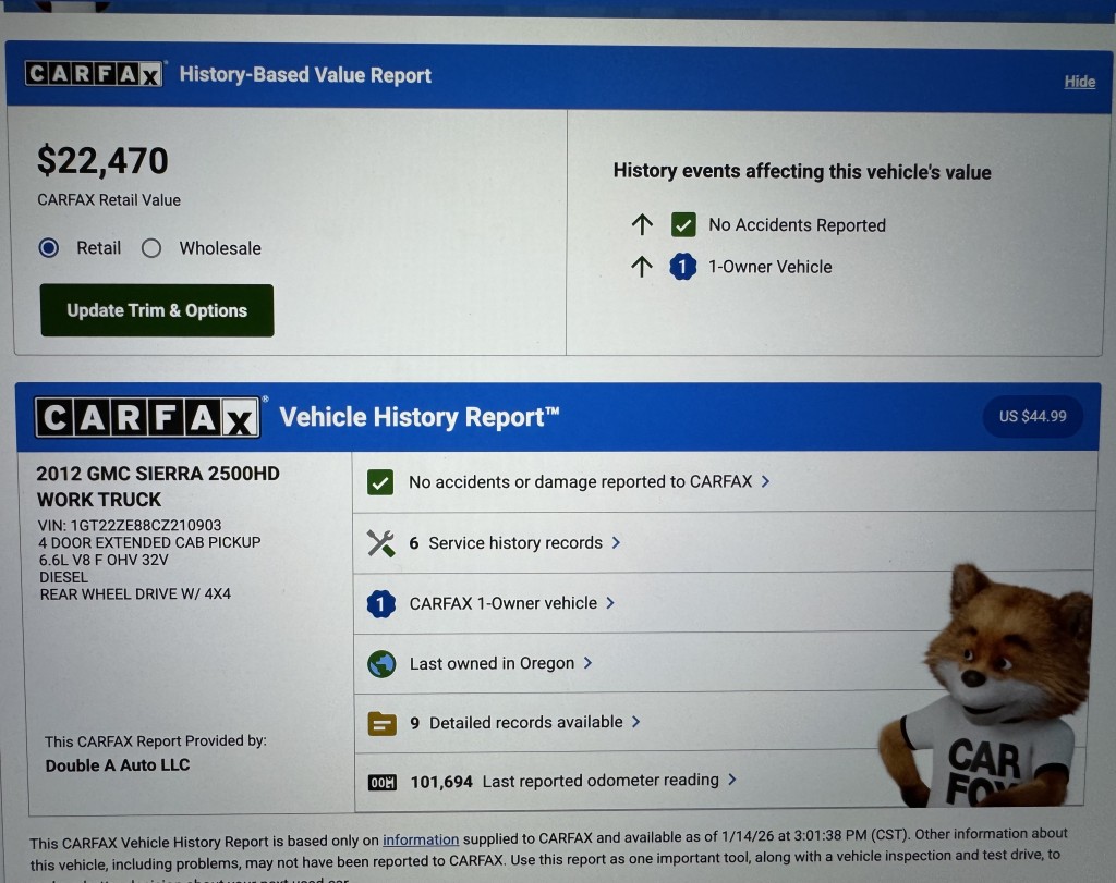 Clean title and NO RUST! Oregon truck. 1 owner. 2012 GMC Sierra 2500HD Duramax DIESEL. Only 126k miles. 4x4. ARE canopy. Spray in bed liner. Clean carfax and no accidents. Good tire tread. Brakes are still good. Non smoker and no odors. Standard bed. Power options and power mirrors. Very clean work truck overall. It runs and drives great and is ready for its new owner. I price my vehicles to sell quick, message to be the first to see it!